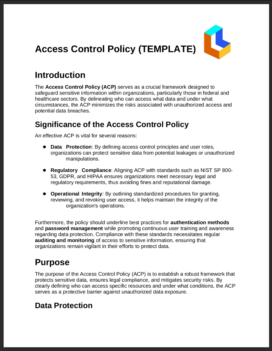 Keep in mind that your access control policy for your business will be different depending on a number of factors. Following a template and adding/removing what is more applicable to your organization will make the artifact more digestible when you or your team review it in the future.