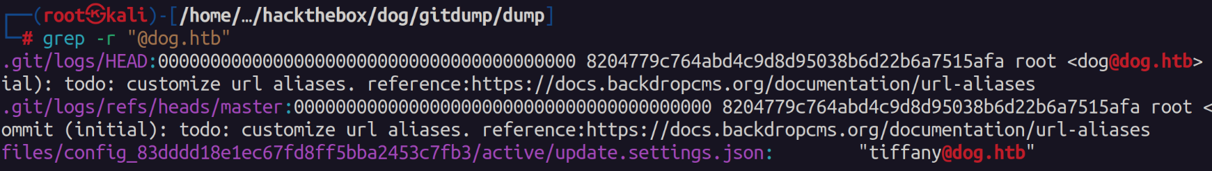 Out of curiosity we can search through the source code and look for any other "@dog.htb" users. To my surprise we do find another user "tiffany".