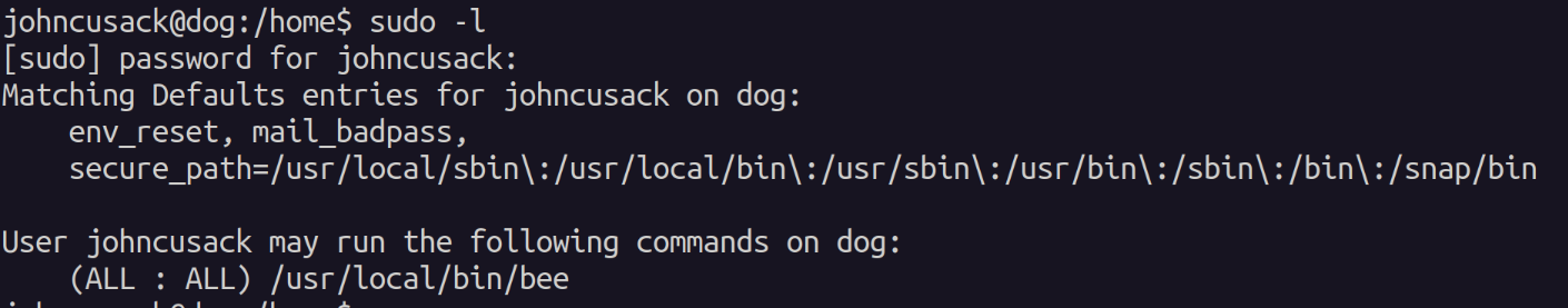 As the johncusack user we see what we can run as sudo and we see that we can run /usr/local/bin/bee without needing to provide a password.