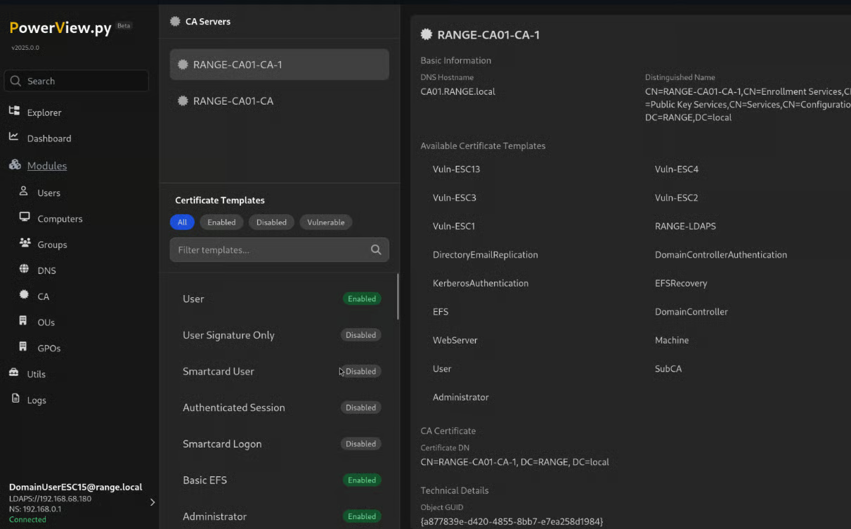 Here we can enumerate and identify vulnerabilities Groups, DNS, Certificate Authorities, Organizational Units, and Group Policy Objects.