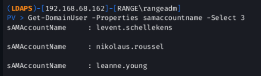 Get-DomainUser -Properties samaccountname -Select 3