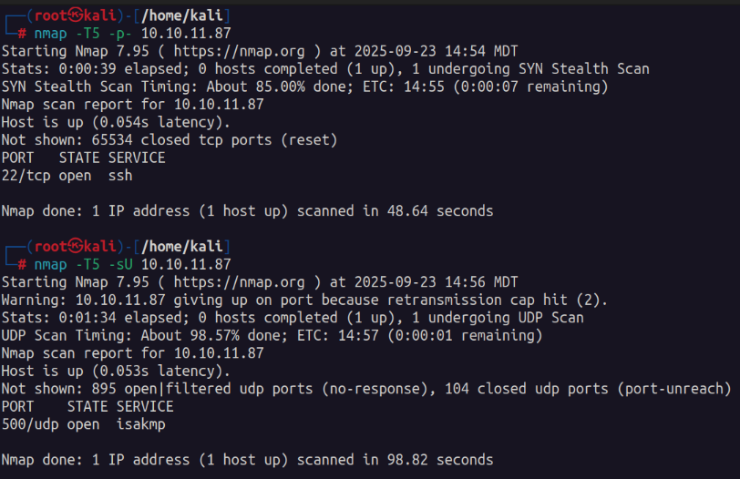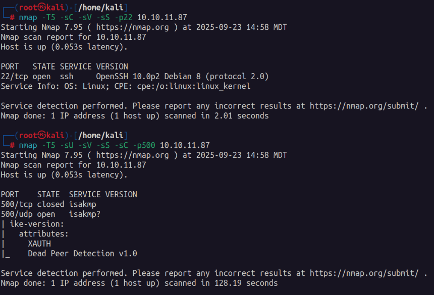 Its here that we notice only port 22 being open on the TCP side. So I scan the UDP ports and identify port 500 IKE being open.