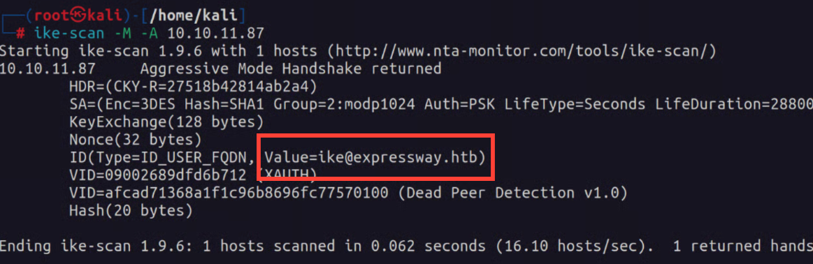 Hacktricks gave me some really good information on the in's and out's of the IKE protocol and some things to look for. For instance we see here the user "ike".