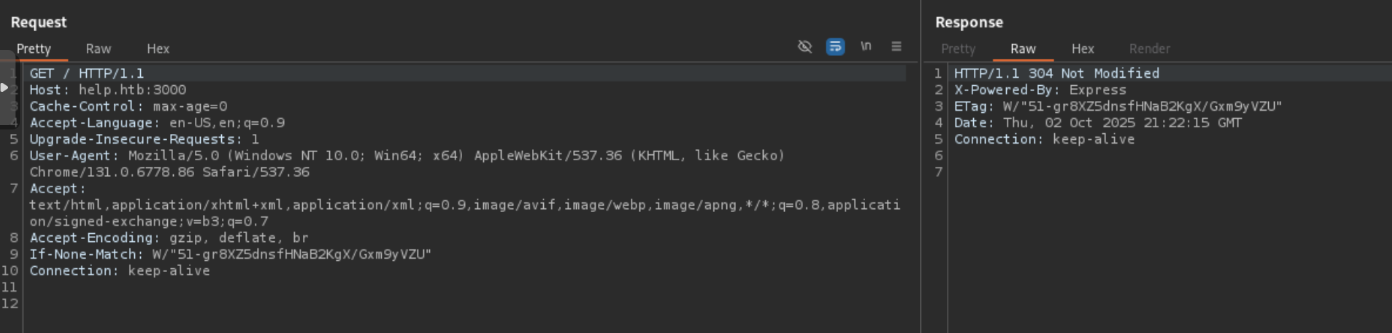 I tried an unauthenticated file upload vulnerability for the HelpDeskZ application that didn't pan out sadly. So I moved back to the API on port 3000. Looking at the request we see a header stating "X-Powered-By: Express" which didn't really give me much info.