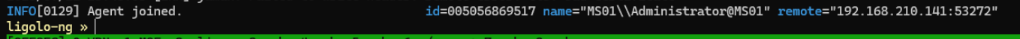 .\agent.exe -connect 192.168.45.157:11601 -ignore-certOnce ran we should be able to see on our machine a message similar to the following.