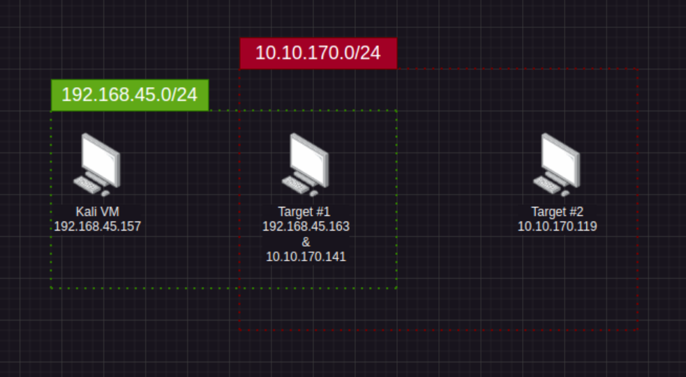 We are wanting to attack Target #2 however, this target on a different network (10.10.170.0/24 - Shown in red). In order to see this target we need to exploit a machine that is connected to our Target #2's network. After some post-exploitation we find that Target #1 has a network interface with the assigned target network Target #2 is on. This is a prime instance we can use ligolo-ng to pivot our traffic through Target #1 in order to exploit Target #2.